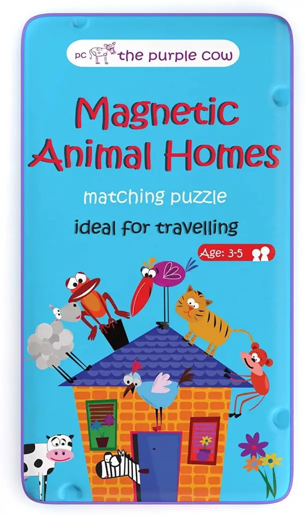 The Purple Cow Magnetic Animal Homes Matching Puzzle is ideal for traveling. This simple matching game puzzle involving animals and their homes. Kids will have fun matching the pieces and assembling the correct pictures. This pocket-sized game comes in a compact high-quality metallic tin box. So it conveniently fits into any pocket, travel bag or backpack.